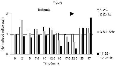 The figure shows relative changes in TSR gain before (time=0), during (2-22.5min) and after (25-47min) ischemia for 3 representative frequency ranges. The gain of the reflex response to the lowest frequencies increased in early ischemia (at 2, 5, 7.5, 10 & 12.5 min) but not significantly (ANOVA, P>0.05) in comparison to control values (time=0). The gain of the middle frequency range increased significantly at 2 min of ischemia (ANOVA, P =0.03) and then declined during 15 - 22.5 min. The high frequency gain was most sensitive to ischemia. It tended to decline 2 min after cuff inflation and remained significantly decreased at 15 and 22.5 min (ANOVA, P<0.05, P<0.01) by about 70% of the control value. The high frequency gain showed significant recovery at 0.5 and 22.5 min after cuff deflation (ANOVA, P=0.002, P=0.003) compared with the last ischemic TSR value.